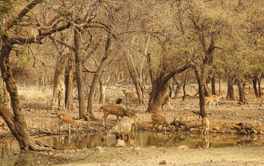 The deer and the antelope are the most numerous attendees. In Ranthambore, a semi-arid dry deciduous forest where I conduct my field work, sambar and spotted deer are most commonly seen at water holes followed by nilgai and chinkara. The colours to the party are brought by our featured friends peafowl, parakeet, golden oriole, as well as the cinereous tit and silver bills. Bringing in the crazy are the langurs fighting and biting and cartwheeling over each other. They all drink water to their fill and cool off their bodies. Apart from hydration, animals here also access minerals through salts dissolved in the water or by licking rocks surrounding water holes. These salts are essential for the metabolism and growth of mammals1.