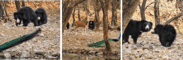 Several species reproduce in spring and summer and the jungle brims with motherly love. Grey francolins line the trails with mother and father followed by as many as 10 chicks, nests of golden orioles and lapwings grace the trees and banks. This was also the time I had a wonderful sighting of a sloth bear and its cub. Not only did I get to see the interactions of a mother and cub sloth bear, the whole sequence was incredibly heart-warming and is particularly memorable. While we stopped to fill water in our bottles at a meeting point, we noticed a sloth bear looking out from far away towards a water hole. It seemed to be afraid to come out with tourist vehicles around. As soon as the vehicles left, it came out accompanied by a timid cub. The cub was nervous to come out in the open- it seemed to be intimidated by the deer and peacocks around. The mother patiently (and in human terms, mutely) pacified and prodded the cub. It slowly and warily came to the water, stopping several times to observe and sniff its surroundings. On reaching the water, both mother and cub bent down to drink. The cub quickly lapped up water and trotted back to the hills finally breaking into a run! One would not have imagined a bear being scared of peacocks and deer but it seems you have to learn to be a bear! The image of this endearing cub is imprinted in my mind.